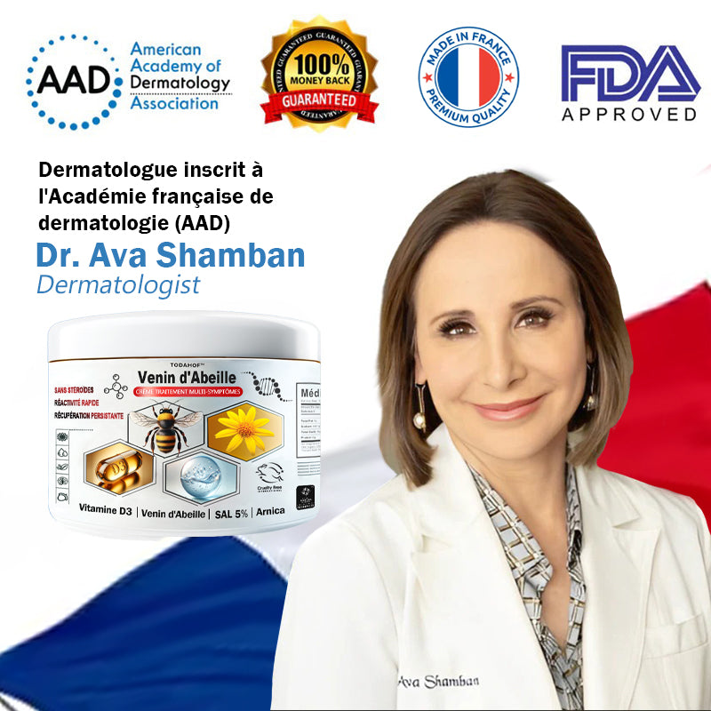 ยซ En tant que dermatologue, j'ai toujours รฉtรฉ passionnรฉ par la recherche de solutions efficaces et naturelles aux problรจmes de peau. Aprรจs des recherches et des tests approfondis avec mon รฉquipe de laboratoire, et des essais cliniques impliquant plus de 2 000 participants, j'ai dรฉcouvert que le venin d'abeille est un ingrรฉdient naturel puissant pour rรฉpondre ร un large รฉventail de prรฉoccupations cutanรฉes. Cela m'a conduit ร crรฉer la TODAHOFยฎย Venin D'Abeille Crรจme Complรจte-une solution tout-en-un conรงue pour soulager naturellement et efficacement de multiples problรจmes de peau avec prรฉcision. ยป ย - Dr Sophie Wells, docteure en mรฉdecine, dermatologue